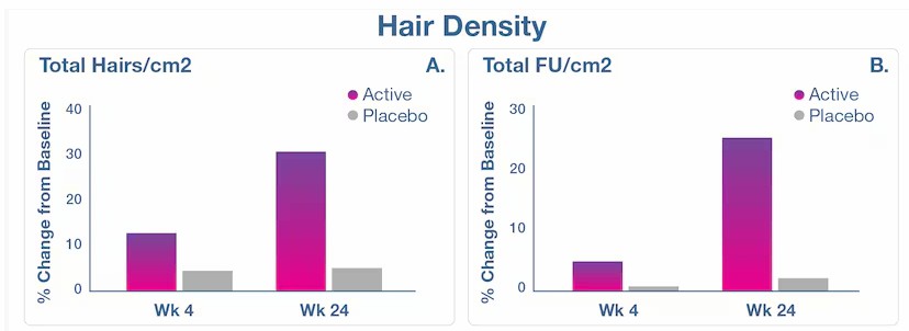 The primary endpoint was the change in hair density and growth at 24 weeks. Secondary endpoints included changes in hair diameter at 4 and 24 weeks and shifts in the scalp microbiome's relative abundance at these intervals. After 24 weeks, subjects using the probiotic-herbal blend saw a 30% increase in hair density (hairs/cm²) and a 25% increase in follicular unit count/cm² compared to baseline, both statistically significant. In contrast, the placebo group showed no significant changes in hair density. A modest 6% increase in hair width was observed at 12 weeks, but no differences were noted between groups.